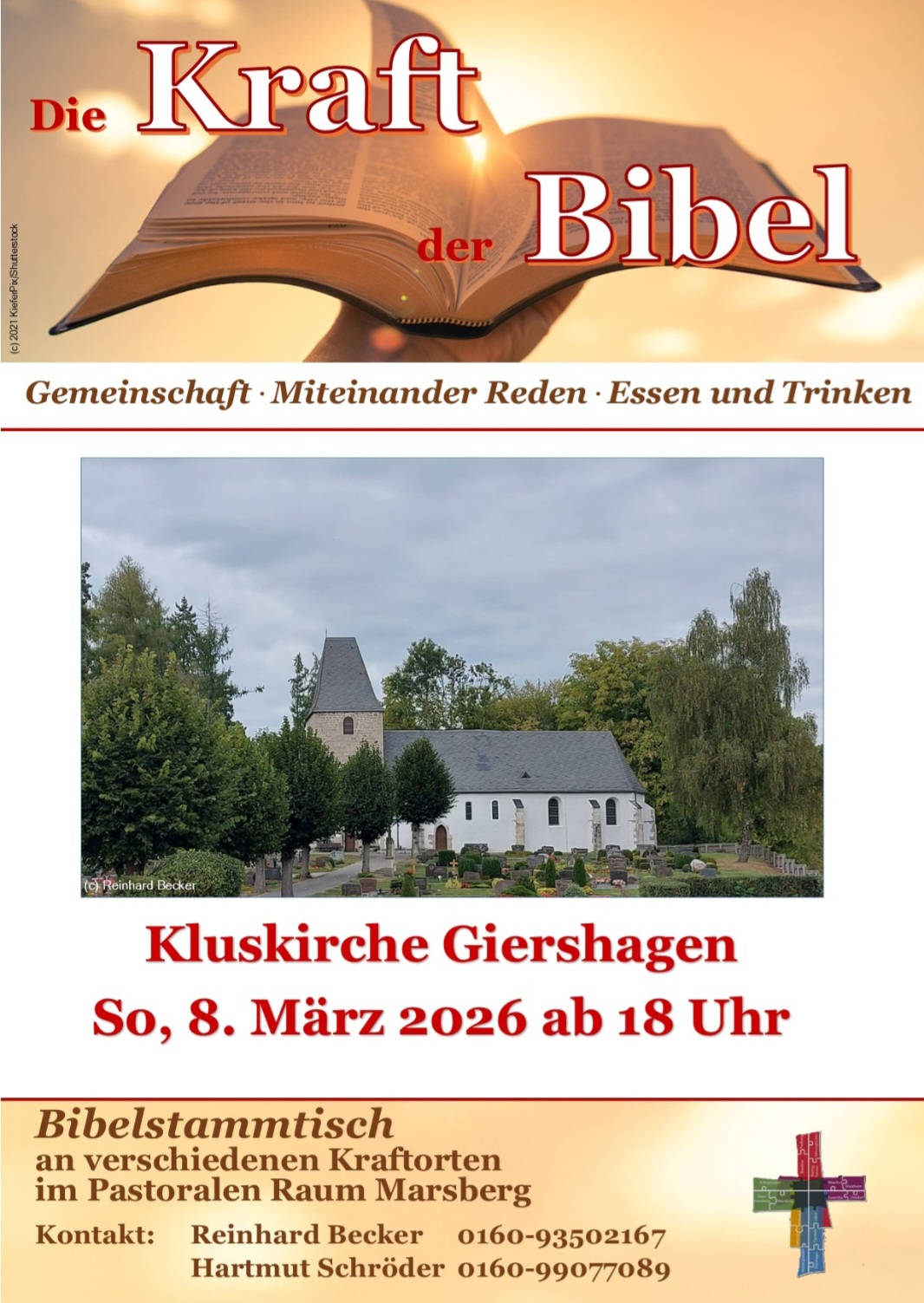 Der Bibelstammtisch findet am Sonntag, 8. März, ab 18 Uhr in der Kluskirche Giershagen statt. Dieser ist Teil einer Reihe von Treffen an verschiedenen Kraftorten im Pastoralen Raum Marsberg und richtet sich an alle Interessierten – unabhängig von Alter oder Vorkenntnissen. Kommen Sie gerne vorbei, bringen Sie Ihre Fragen mit und lassen Sie sich von der Kraft der Bibel inspirieren.